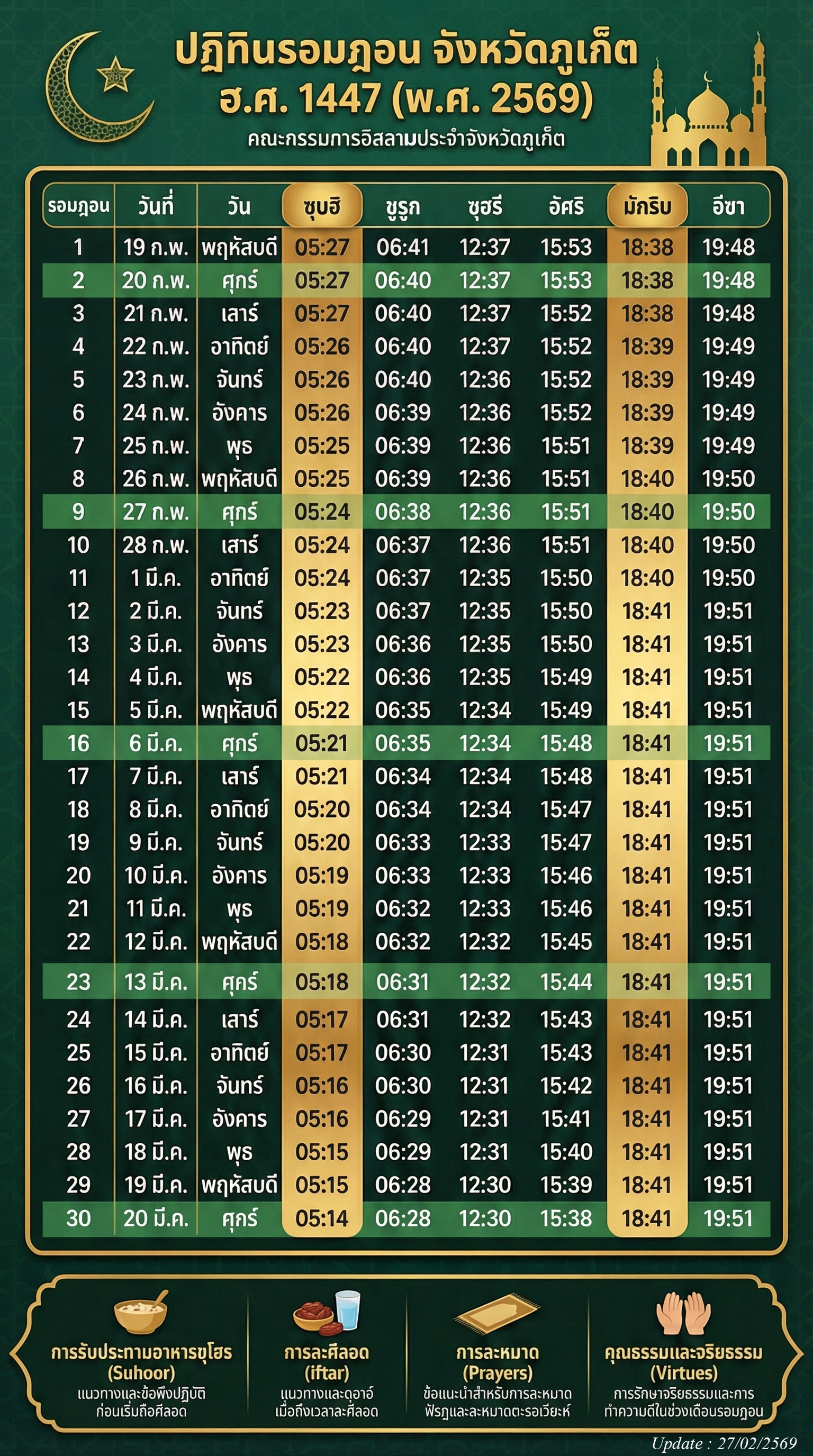 | รอมฎอน | วันที่ | วัน | ซุบฮิ | ชูรูก | ดูฮุร | อัศริ | มักริบ | อีซา |